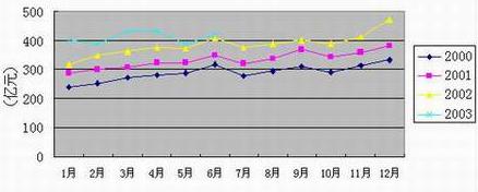 图1为2000-2003年通信业务收入各月净增量曲线,2003年1-6月通信业务收入发生一定波动。4月通信业务收入431.5亿元,为上半年单月收入最高月。5月由于受“非典”影响及部分企业调整了统计口径使收入数有所减少,5月业务收入仅为389.1亿元,为上半年单月收入最低月。6月业务收入达到421.7亿元,又重新回到“非典”前的正常水平,但是仍比“非典”前的3月份略有减少。