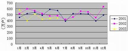 1.固定电话:保持快速增长势头。1-6月,全国固定电话用户新增2338.8万户,达到2.38亿户,比上年同期增长19.6%,平均月新增389.8万户,远高于2001、2002年的月均新增296.2、282.1万户。其中,城市电话用户新增1522.3万户,达到1.51亿户;农村电话用户新增816.5万户,达到0.87亿户。2001-2003年固定电话用户各月净增比较情况如图2所示。