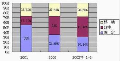 由2001年占整个长途通话的55%,迅速下降到目前的30.1%。随着移动长途、IP长话的异质竞争加剧,大量分流了传统固定长途,2003年1-6月传统固定长途中国内长途、国际及港澳台通话时长比上年同期分别下降0.6%、6.4%、13.9%,而移动、IP的国内长途、国际及港澳台通话时长平均以20%的速度增长,两者形成了鲜明的反差。