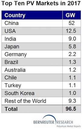 Bernreuter Research的供应侧分析得到85个国家自下而上的光伏需求评估的支持,预计2017年全球安装量为96.5GW,比2016年的超过74GW增长30%。另一个指标是同样的方向:通过从四大模块供应商晶科,阿特斯,晶澳太阳能和韩华Q电池的总体出货指导中推算出全球需求,贝纳特勒研究在2017年得出了类似的结果。