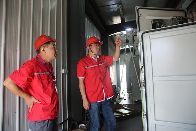 这几天秋老虎依然发威,在海安项目现场,伴随着电焊机打磨的花火与电钻“突突突”的配乐,只见王琪在开关柜前这边按一按,那边转一转,轻车熟路地就找到了问题的症结所在,然后从“百宝箱”里拿出各种工具,着手解决问题,不一会儿汗水便浸湿了后背。施工单位的人团团围着他问这问那,他摊开图纸告诉他们要怎么解决问题,只见汗水顺着脸颊不停滴落在图纸上。