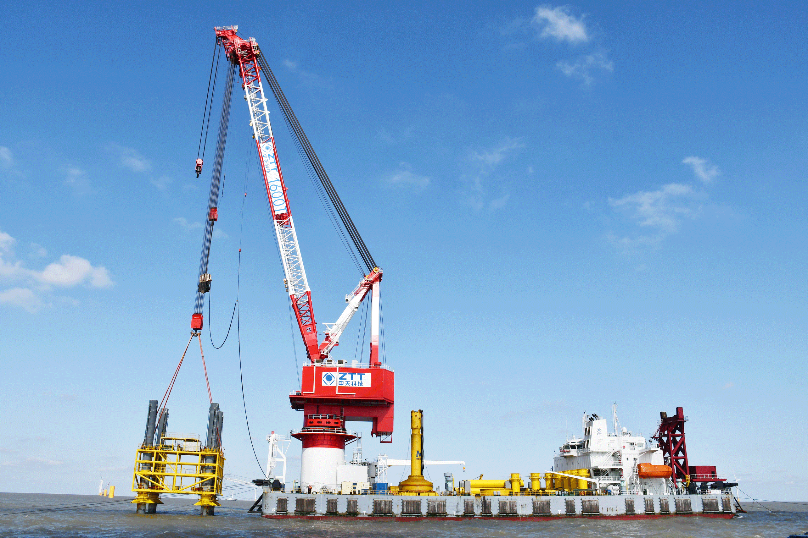 该项目位于盐城市大丰区东侧的毛竹沙海域,风电场中心离岸距离达55km,滩面高程-3.3~-12.8m。项目共沉桩31根,其中5MW级单桩起吊重量达1100吨,是德赢VWIN海洋工程首次进行千吨级单桩施工的项目。