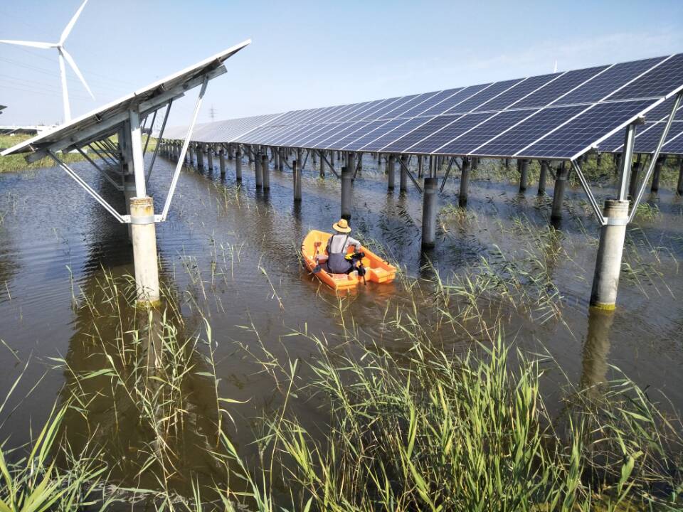 在“水上光伏,水下鱼虾”的空间阵列当中,光伏板为鱼虾提供遮挡,夏季水上遮阳、水下降温,冬季抵挡快速降温、防止霜冻,实现了渔业养殖和光伏发电互补。